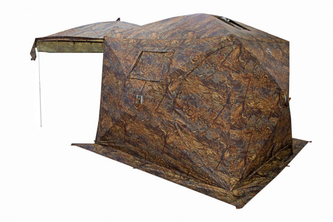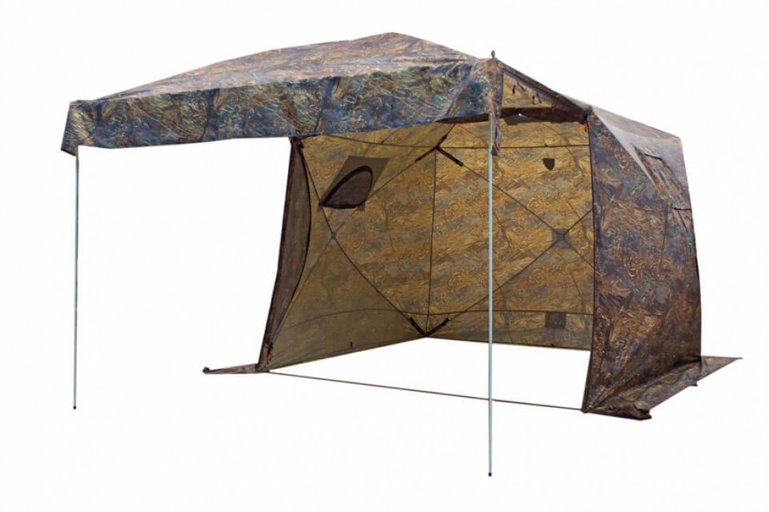 Для использования палатки в теплое время года предусмотрена откидная стенка, которая устанавливается на стойки (поставляются в комплекте с палаткой) и образует навес. Навес может быть оборудован съемной верандой по всему боковому периметру. Дополнительную площадь вы сможете использовать в качестве кухни, летнего спального отсека или для хранения снаряжения.