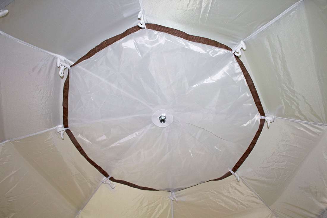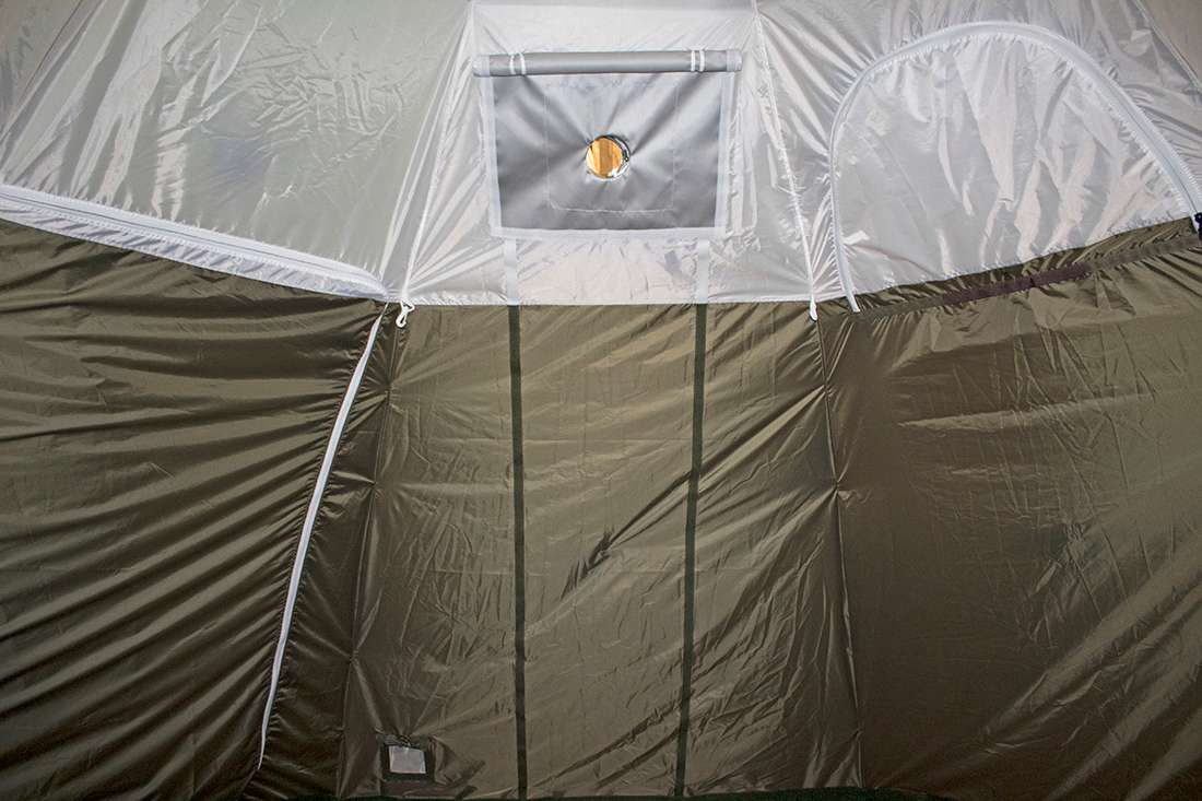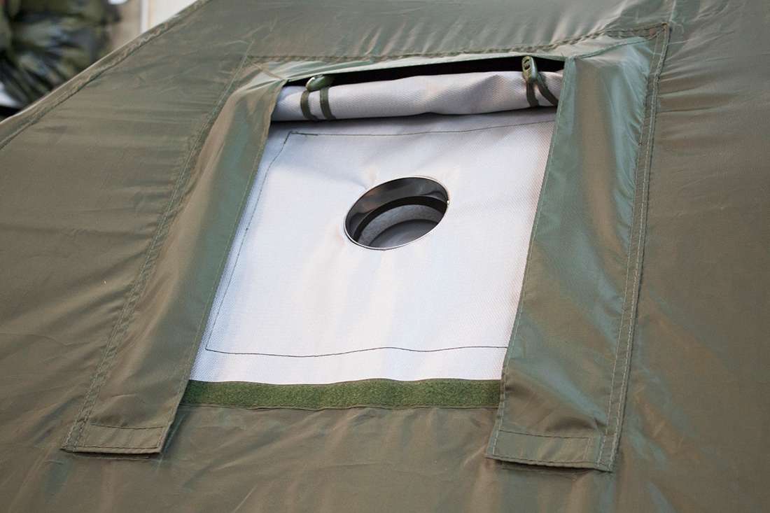 Дополнительный приток воздуха, при использовании походной печи, обеспечивается вентиляционным окном в нижней части палатки.