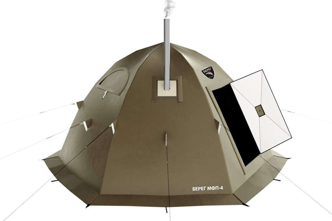Всесезонная палатка Берег МФП-4 Берег – двухслойная зонтичная, полуавтоматическая палатка с возможностью быстрой сборки и системой зонтичного раскрытия.