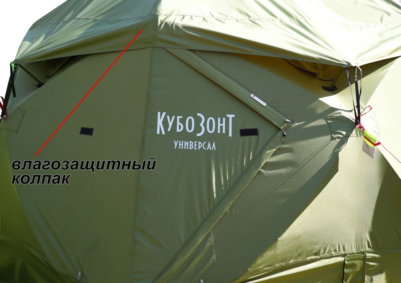 Влагозащитный колпак дублирует вытяжной клапан в макушке палатки, все четыре окошка, а также формирует защитную планку для съемной распашной двери. В дублирующих окна элементах колпака встроены опорные стоечки, с регулировкой их натяжения, благодаря которым открытые в палатке окна надежно защищены колпаком от осадков. При этом сквозь окна поступает уличный свет и доступен внешний обзор. Опорные стоечки создают вентилируемый воздушный зазор между колпаком и крышей палатки, благодаря которому купол палатки приобретает дополнительную теплоизоляцию в холодную погоду и меньше нагревается в жаркую погоду.