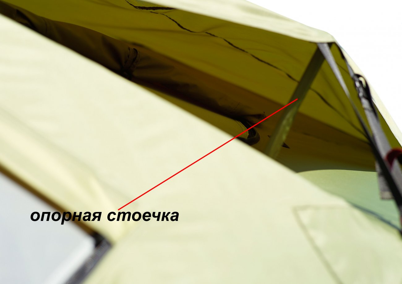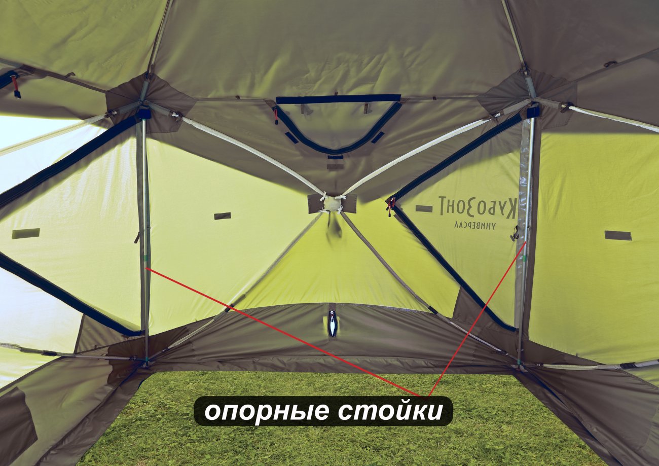 Большая палатка кубозонт гарантирует пользователям монолитную устойчивость даже в штормовую погоду. Для обеспечения максимальной ветроустойчивости укрытия необходимо установить по всем четырем углам палатки опорные стойки, которые входят в базовую комплектацию, закрепить все внешние крепления к грунту (четыре усиленные петли по углам под внешней юбкой), а также закрепить шнуры-растяжки по всем четырем стенкам.