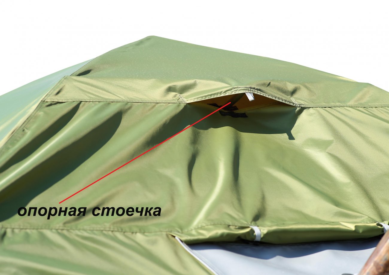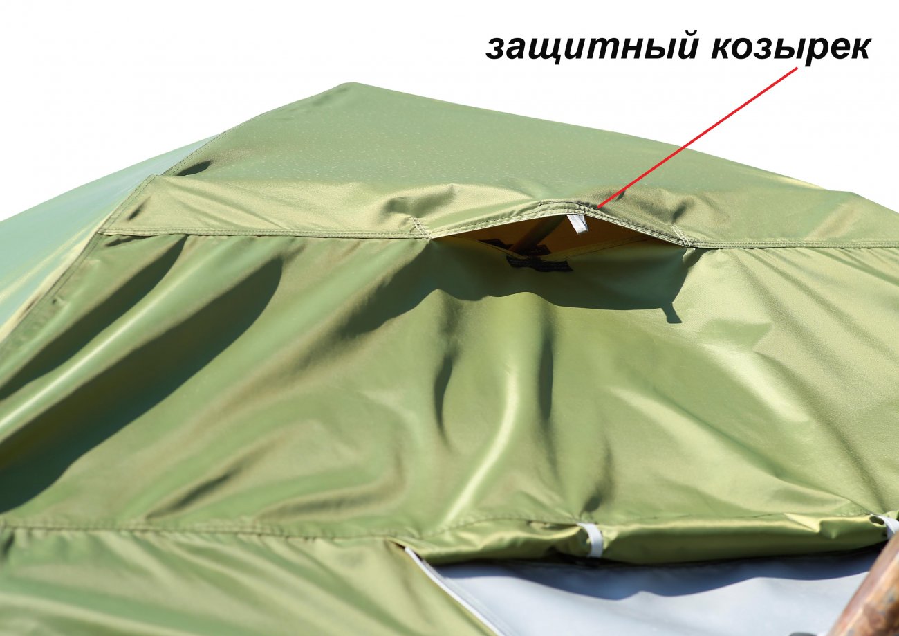 Дополнительный внешний тентовый слой (влагозащитный колпак) выполнен из прочной водостойкой ткани. Швы колпака проклеены герметизирующей лентой. Влагозащитный колпак полностью защищает верхнюю часть палатки от промокания, дублируя, при этом, вытяжной клапан в макушке палатки и все четыре окошка, а также формирует защитную планку для съемной распашной двери.