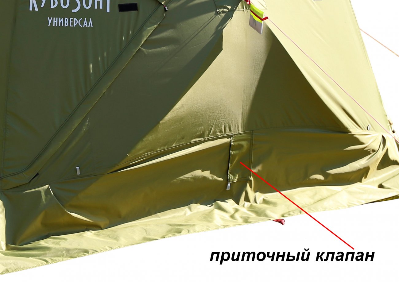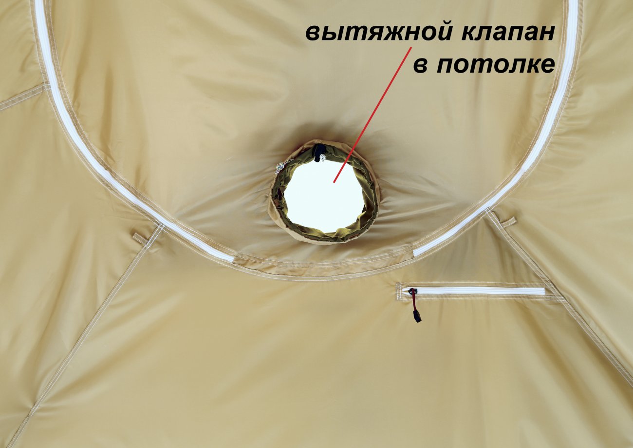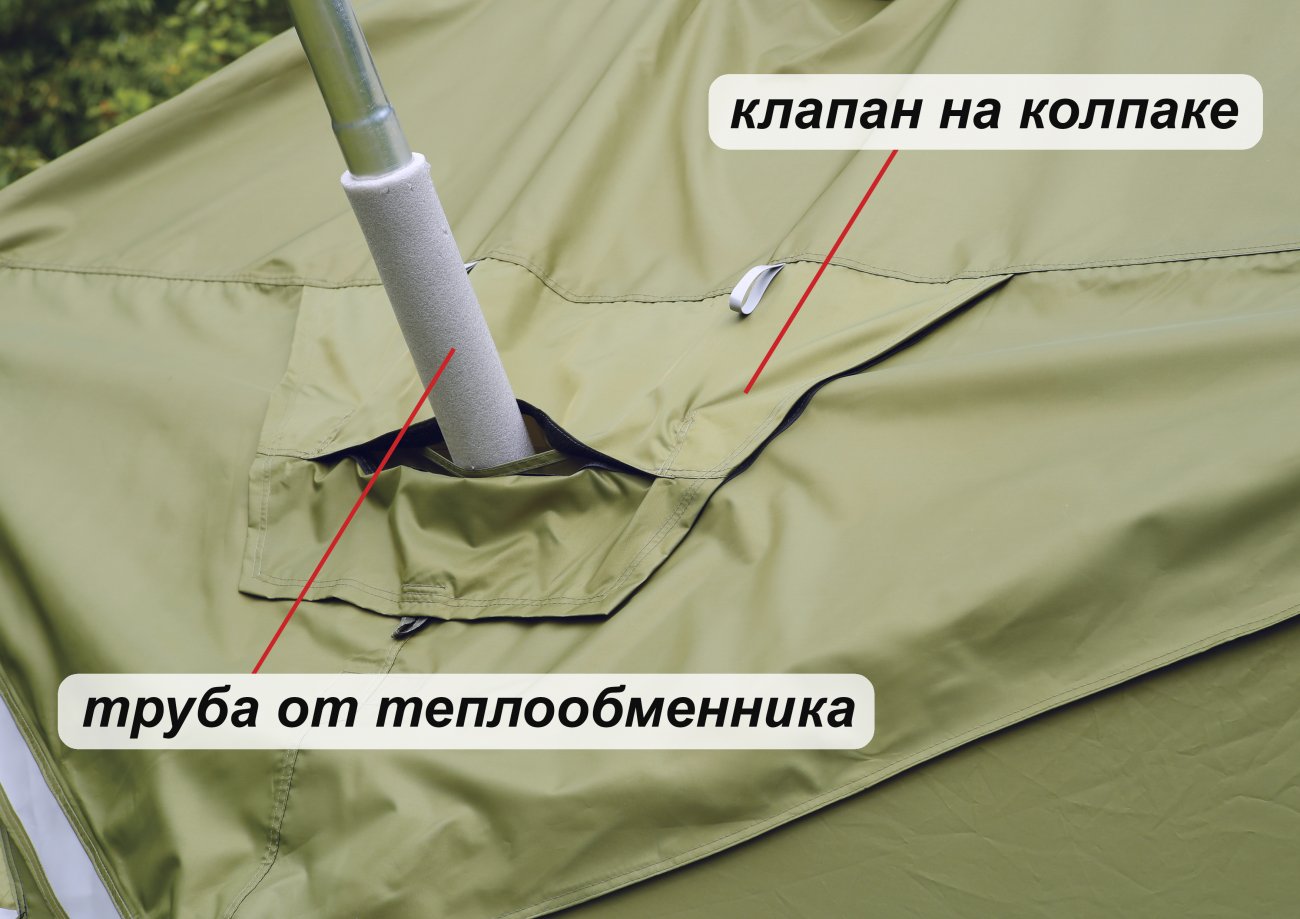 Окошко в палатке, предназначенное для установки вытяжной трубы от теплообменника или от дровяной печи, дублируется на колпаке специальным клапаном под трубу. При эксплуатации палатки с теплообменником, вытяжная труба выводится через этот клапан, который обеспечивает водостойкость в зоне вывода трубы. При эксплуатации палатки с дровяной печью, вытяжная труба выводится через полностью открытый клапан на колпаке, при этом, в сам проем этого клапана устанавливается специальный огнеупорный фартук, обеспечивающий защиту зоны вывода трубы от осадков. Клапан на колпаке подворачивается и крепится клевантами с небольшим навесом сверху на огнеупорный фартук, что предотвращает затекание воды под фартук во время дождя.