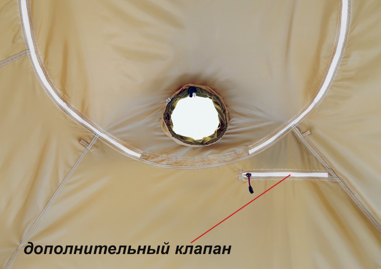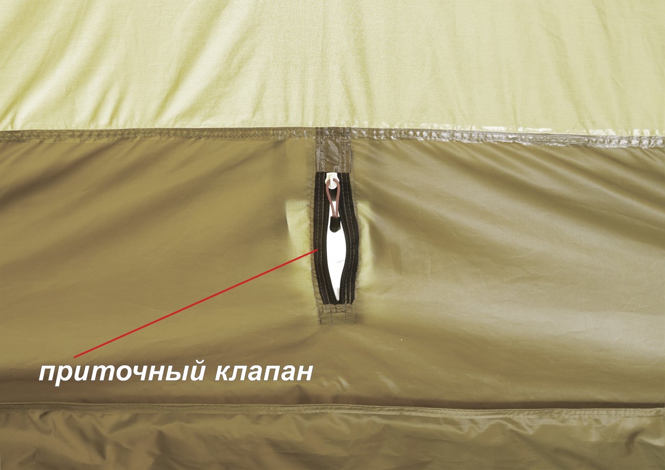 Вытяжной клапан оснащен противомоскитной сеткой, поэтому, для доступа к защитному козырьку вытяжного клапана с внутренней стороны палатки встроен дополнительный клапан, который продублирован как на внутреннем, так и на внешнем тентах. При необходимости, через эти открытые клапана можно закрывать/открывать защитный козырек, не выходя из палатки.