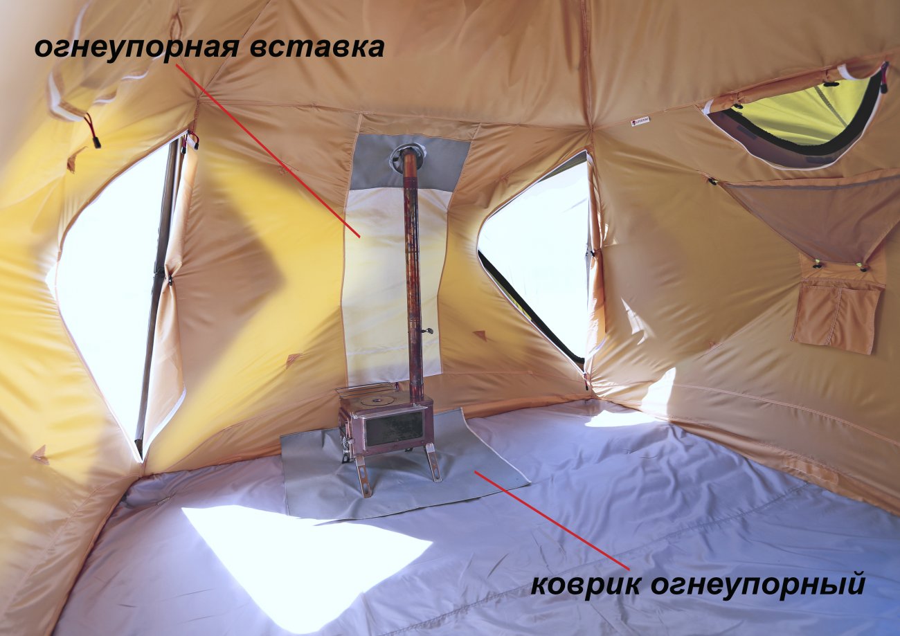 На одной из стенок внутреннего тента встроена огнеупорная вставка с клапаном для безопасной установки отопительной печи, при этом, воздушный зазор между тентами исключает повреждение внешнего тента тепловым нагревом печи. Огнеупорный клапан изготовлен из прочной, эластичной кремнеземной ткани с двухсторонним полиуретановом покрытием (плотность 600 г/м2). Материал клапана выдерживает температуру до 1000 °С и позволяет устанавливать в палатке туристическую дровяную печь высокой мощности. Огнеупорная вставка на стенке тента выполнена из ткани «ТАФ» и рассчитана на температуру +280 °С. При интенсивной эксплуатации отопительной печи, а также, эксплуатации печи в режиме максимальной мощности, в зоне разделки (место фиксации трубы в огнеупорном клапане) рекомендуется установить дополнительный теплоизолятор.
