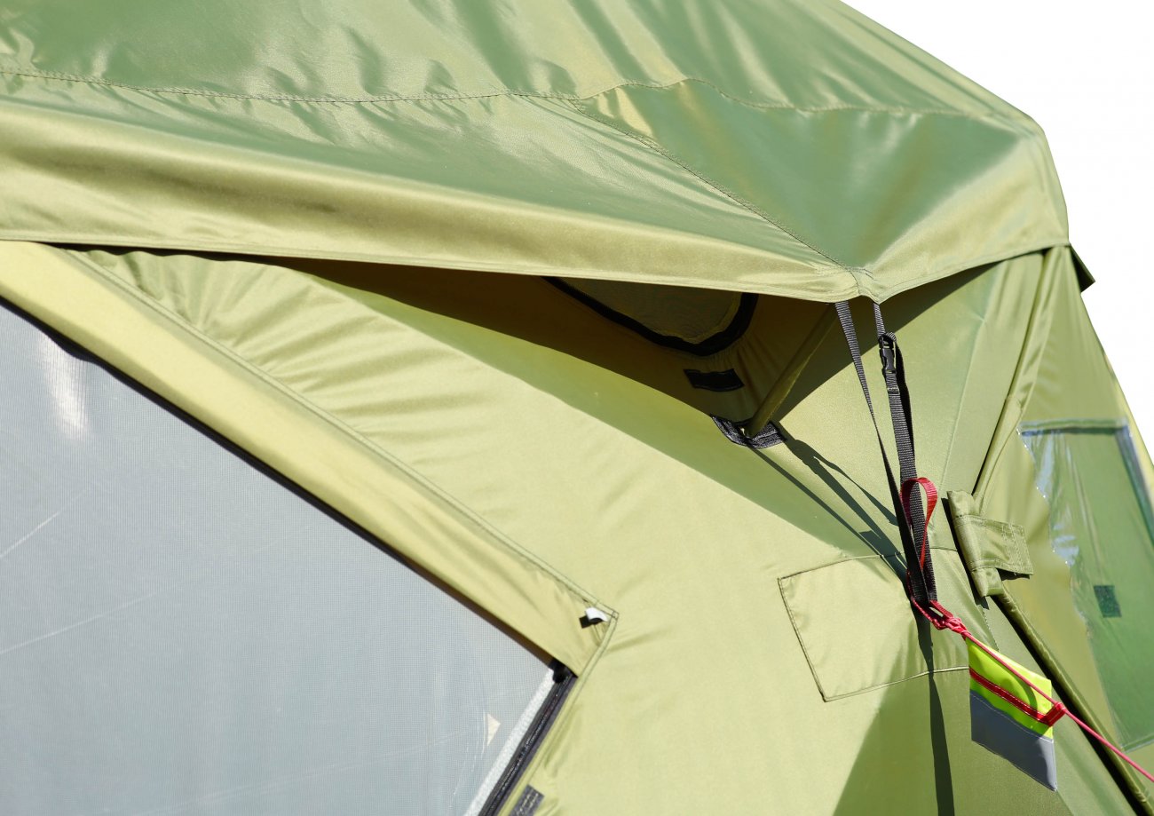 Внешний тентовый слой изготовлен из прочной износостойкой ткани высокой влагостойкости с применением высокотехнологичных средств герметизации швов, а также влага- и ветрозащиты дверных, оконных и вытяжных проемов. Все дверные и оконные проемы, а также приточные и вытяжные клапаны оснащены противомоскитными сетками.