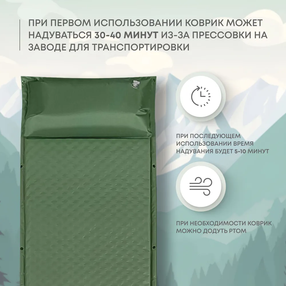 Материал коврика начинает самонадувание сразу при открытии клапана и заканчивает при достижении равновесия между атмосферным давлением снаружи и внутри коврика и зависит от высоты над уровнем моря (чем выше, тем ниже давление) и температуры окружающего воздуха (чем теплее, тем материал более пластичен и легче набирает форму). Коврик не предназначен самостоятельно надуваться до конца, так как некоторым людям нравится спать на более мягком, но в то же время другим, нужна жесткая поддержка хорошо надутого коврика, в таком случае необходимо самостоятельно отрегулировать количество воздуха - дополнительно надув его. Так же хотим обратить ваше внимание, что указанная толщина коврика – это фактический размер пенополиуретана, при этом в производстве используется на 4% больше нормы, для гарантии толщины коврика в полностью надутом состоянии.