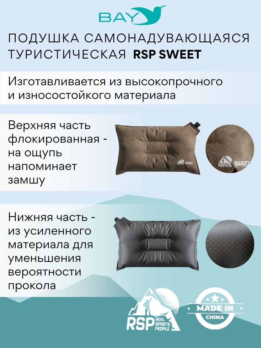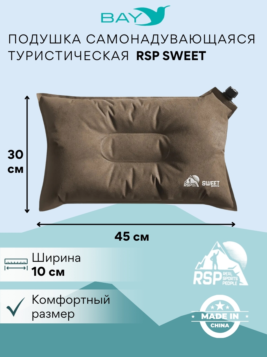 Самонадувающаяся подушка Sweet от бренда RSP – это превосходный аксессуар для сна в походных условиях. Благодаря небольшому весу и компактным размерам в сложенном состоянии, она идеально подходит для кемпинга, пеших и вело/мотопоходов, а также для путешествий на автомобиле, автобусе или самолете.